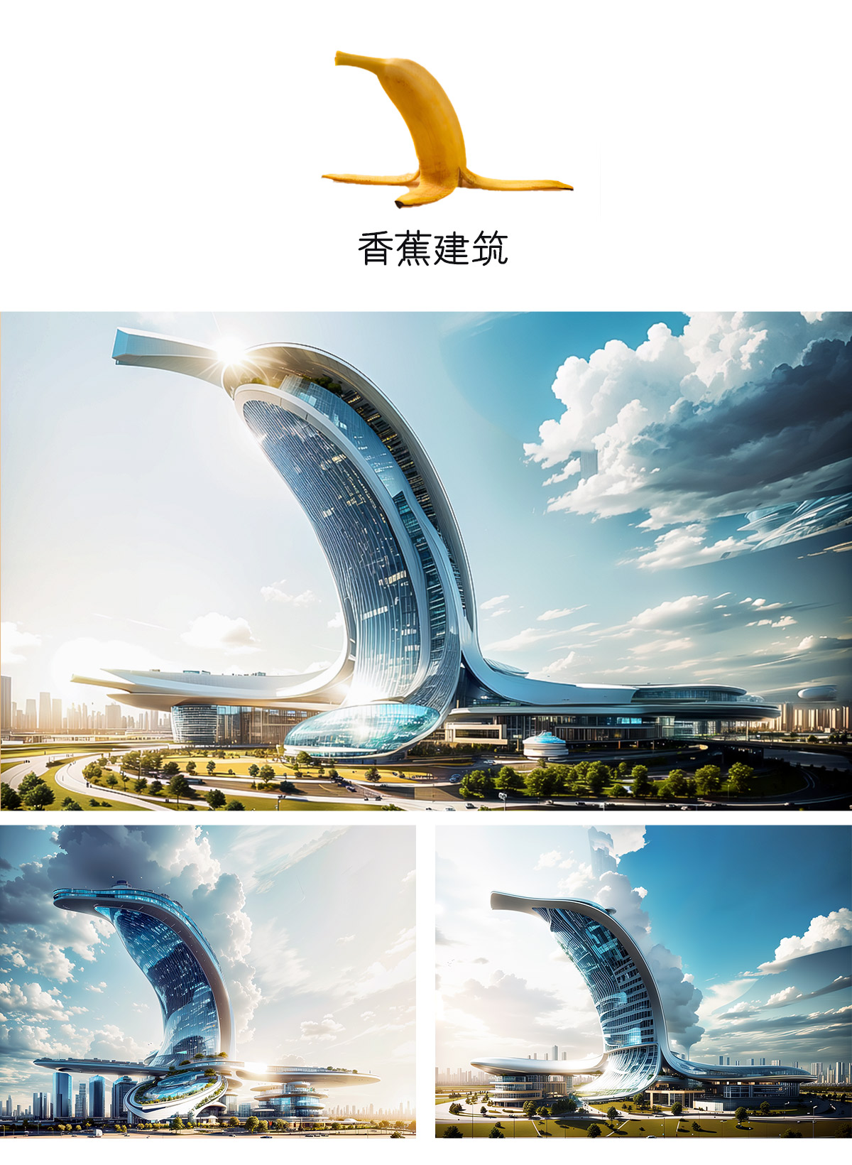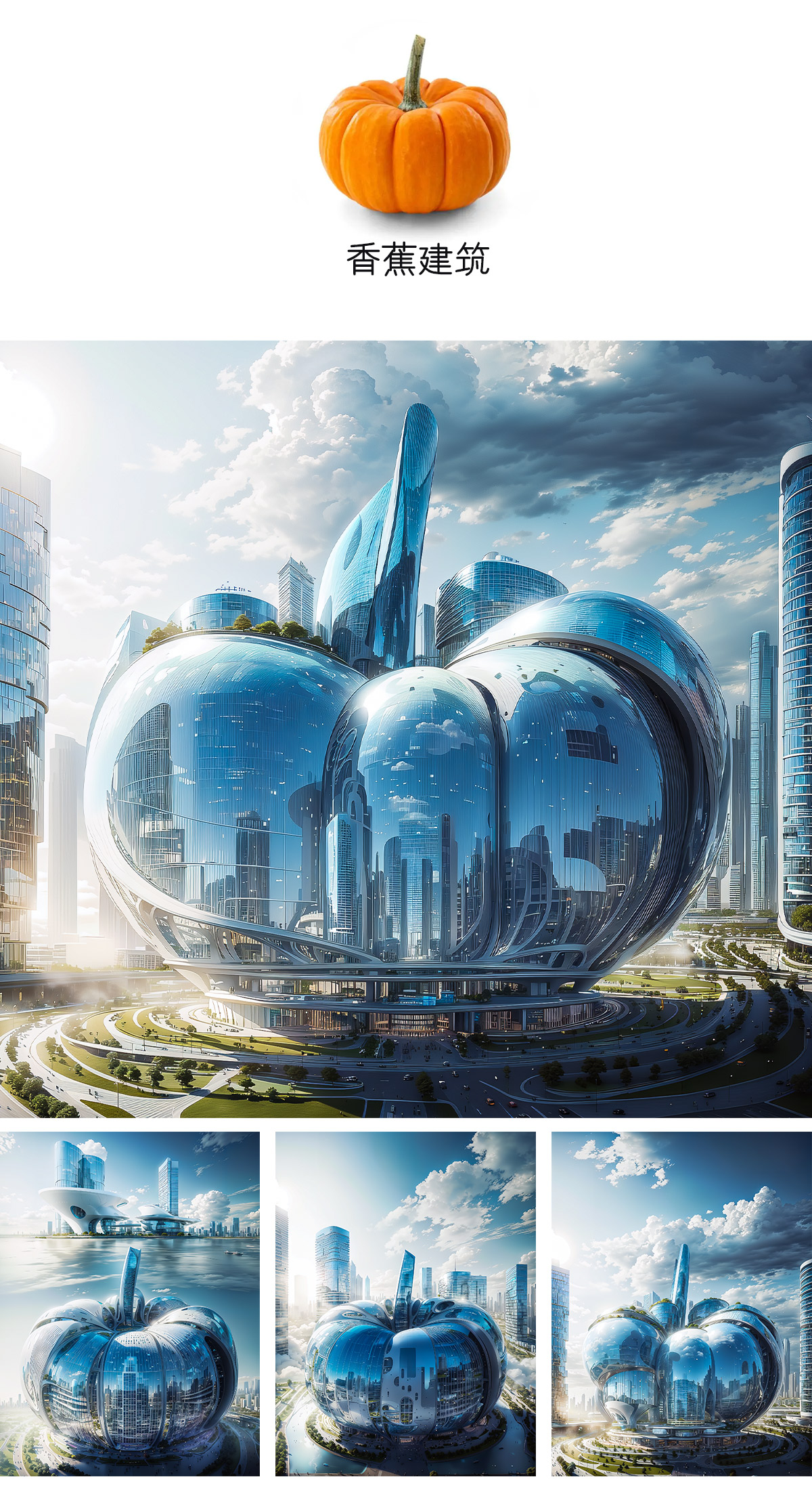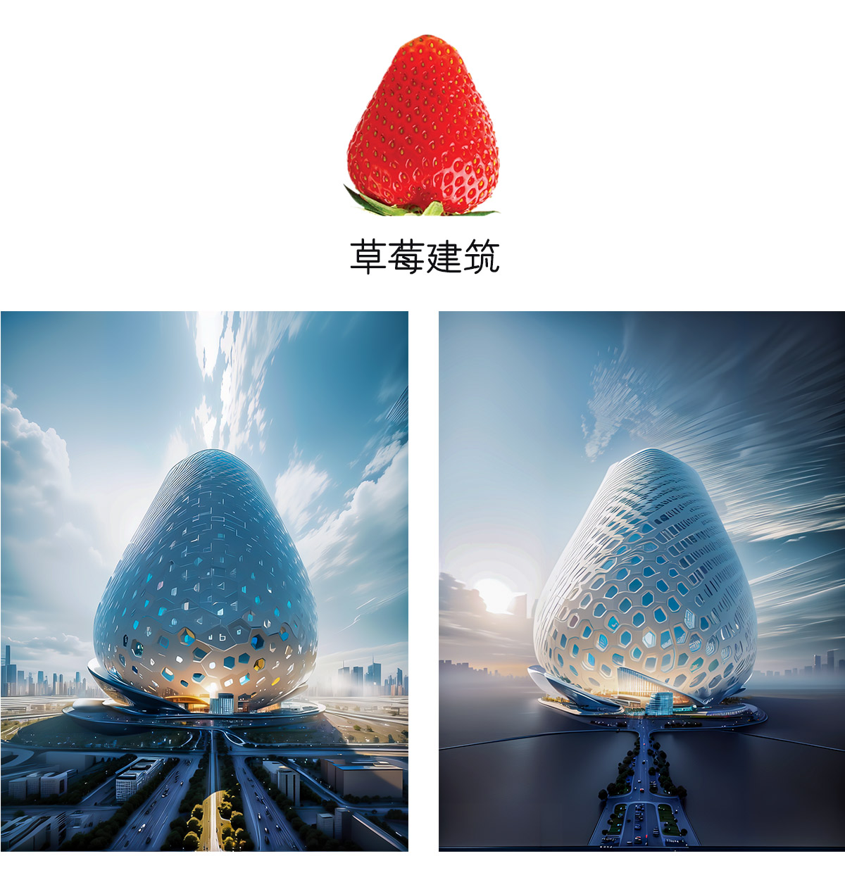 应用AI工具可以识别物体轮廓,并根据物体轮廓生成建筑。比如水果造型建筑,蔬菜造型建筑,为建筑设计提供前期概念图创意解决方案,大节省设计师人力成本。